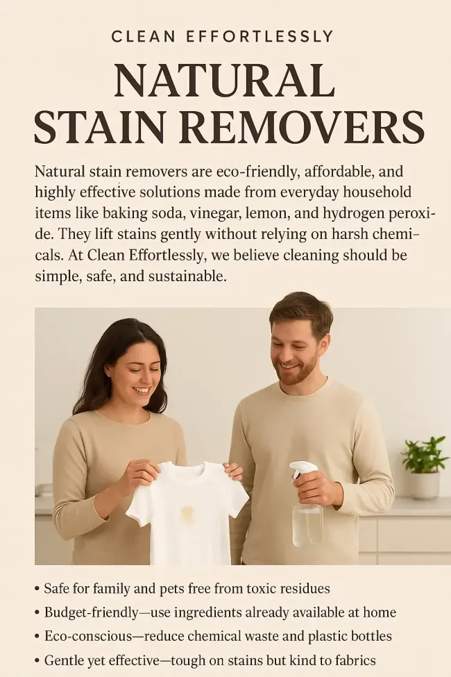 Natural stain removers are eco-friendly, affordable, and highly effective solutions made from everyday household items like baking soda, vinegar, lemon, and hydrogen peroxide. They lift stains gently without relying on harsh chemicals. At Clean Effortlessly, we believe cleaning should be simple, safe, and sustainable—and natural stain removers are the perfect answer.
